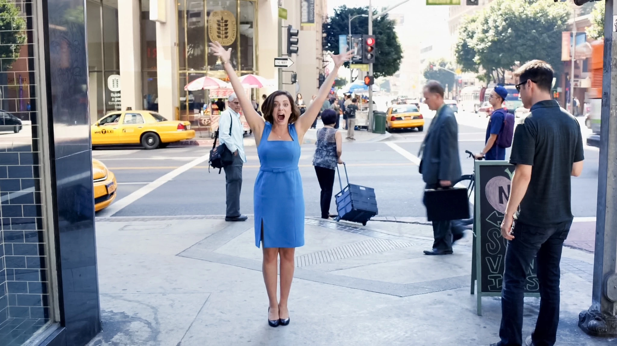 Rebecca Bunch was living in New York City in a fancy apartment but was depressed despite her succesful career as a real estate lawyer. Upon learning she was getting a promotion at the law firm of Sampson & Saunders she felt even more anxiety. She left the building and went to the streets to collect herself in an alley. After failing to take pills to calm herself down she prayed for a sign from God to tell her what to do. She noticed a large banner from an omnipresent Butter marketing campaign which posed a question she had seen a lot of: "When was the last time you were truly happy?" which resonated with Rebecca. A part of the sign which had an arrow malfunctioned and pointed towards a pedestrian.