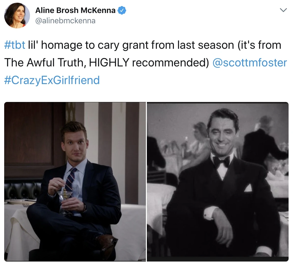 Co-creator and showrunner Aline Brosh McKenna tweeted that Nathaniel’s appearance at the restaurant was meant to pay homage to a similar scene in the 1937 comedy “The Awful Truth” starring Cary Grant.